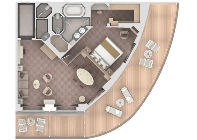 | O2 - Owner's Suite 2 119 - 129 m² (vrátane veľkej verandy). Owners Suite O1 spojená s Panorama Suite. 9. paluba - stred. Max 5 osôb. | 36 800 € 36 800 € za osobu |
