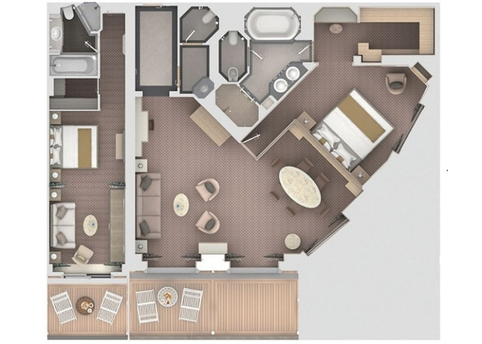 | R2 - Royal Suite 2 142 m² (vrátane balkóna). Royal Suite R1 spojená so Superior Veranda Suite. 7. paluba - vpredu. Max 5 osôb. | 30 400 € 30 400 € za osobu |