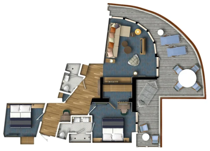 | SPNO - Panorama Suite 73-77 m² + balkón 31-36 m² so stolom, ležadlami a hojdacou sieťou. 2 spálne a 2 kúpeľne. 6,9,10. paluba. Max 6 osoby. Výhody Suite. | 21 196 € 5 299 € za osobu | ||